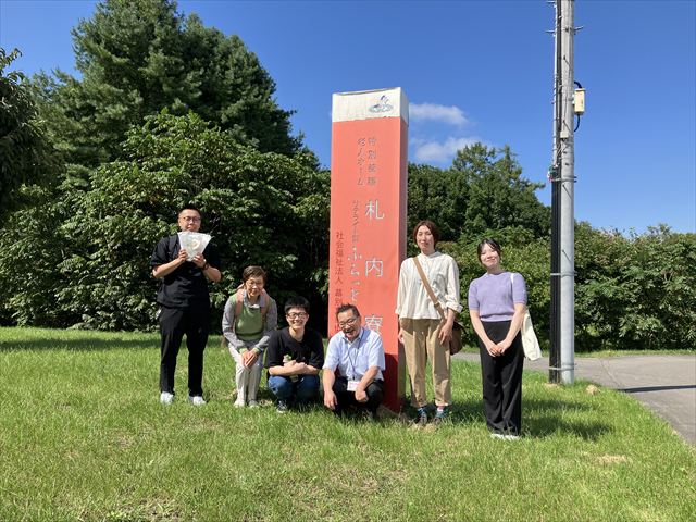 施設の前で委員会メンバーと札内寮の成田施設長と一緒に記念撮影✨
